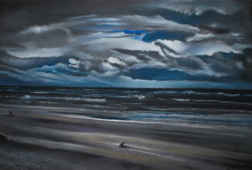 Speaking of moody, this dramatic painting by Andrzej Siewierski of roiling clouds and rolling waves certainly fits the bill. It’s called ‘Wind’ and you can feel the wind blowing wildly as well as feel the dampness of the water in the air. I like the way Andrzej has kept the colour choices limited – blues, blacks, whites, small hints of purple, and a wee bit of ochre warmth in the foreground. I also like the simplicity of the composition divided as it is between sky and water. The line of the cloud at the top swirls us around and down to the water on the right while the diagonal of the beach moves our eye back to the left side of the painting. There’s something about this piece that reminds me of the work of Lawren Harris. I couldn’t find a website for Andrzej but here’s a good article on him and his work.