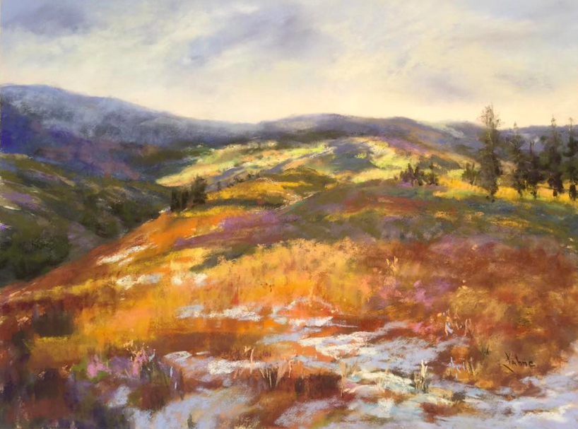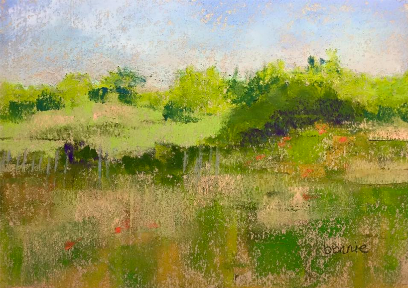 Don’t be fooled. This gem of a landscape is only 5 x 7 in! Bonnie uses the texture and the warmth of the paper to pull all these various greens together. The simplicity of this piece just goes to show that often there’s no need to be fussy and detailed to make a statement about the landscape, to capture an impression of a view. Half close your eyes and you see a field of colours and beyond that, trees with deep shadows below, and then more fields in the distance, all with a cool sky overhead. Check here for more of Bonnie’s work.