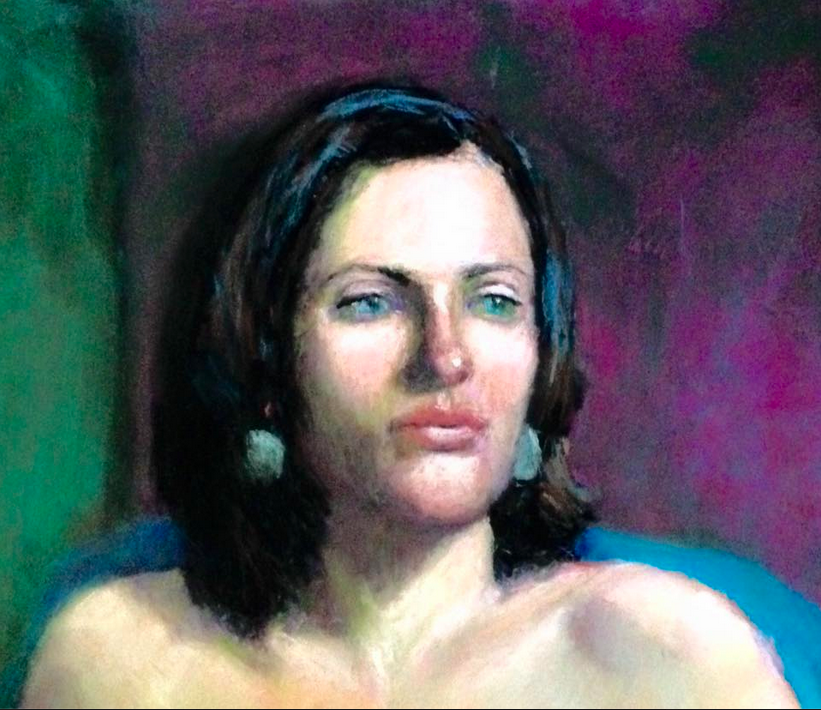 Continuing the moody theme, check out this painting by Jana Volkmer. I love the way she has repeated the blue colour in areas throughout the painting – eyes, hair, earrings, cloth-covered chair. This is a cool painting enhanced by the warmth of the voluptuous lips and other parts of the face. It’s not detailed and yet there is so much we can read into this painting. This woman looks as if she is about to speak, to give us her thoughts on something.There’s a tenseness in her shoulders. The surrounding colour seems to reinforce the feeling of unease. See more of Jana’s work on her website.