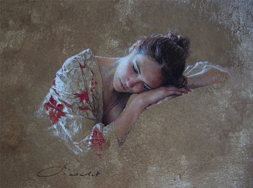 I recently discovered the work of Nathalie Picoulet. Her drawing skills are immediately evident as she renders the human figure so accurately and so sensitively. The way Nathalie vignettes her painting is unusual and distinctive as is her subdued colour palette. I like the way Nathalie hones in on what’s important – here it’s the girl’s face resting on her hands and also a part of the gown of orchid-printed material that inspired the title. Nothing else is required. We see this young woman and wonder what occupies her thoughts.