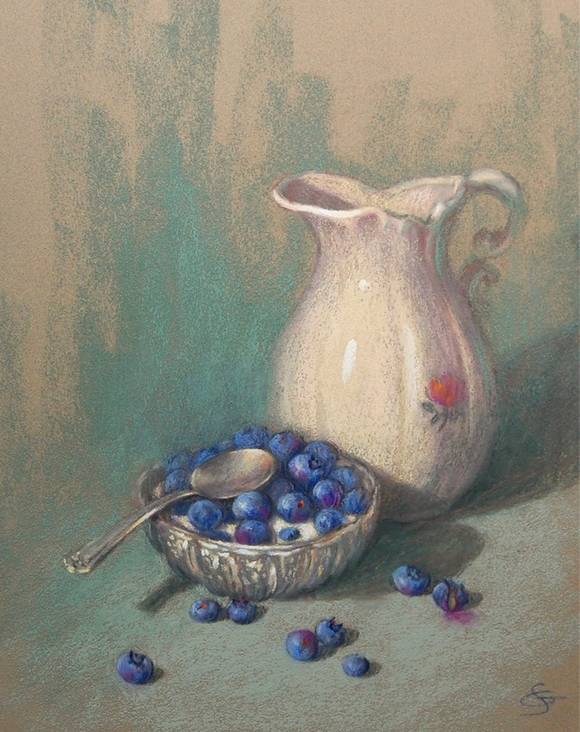 Moving from the warmth and vitality of the pastel above, we come next to Suzanne Godbout’s quiet contemplation of a pitcher with a bowl of blueberries floating in cream. There’s an elegance here that with detail and looseness, captures the solidity and sheen of ceramic, the lustre of metal, and the soft lushness of fruit. The painting has an old-fashioned sweetness that appeals to me – a reminder of the simplicity of childhood, a memory of being in my grandmother’s kitchen, a suggestion of abundance, a recollection of how good a bowl of fresh berries and cream taste. Yum! I love the way one of the blueberries has split open – you see the stain it’s produced on the cloth and the green colour inside. I could pick these blueberries up and eat them right off the paper! Read more about Suzanne and her work here.