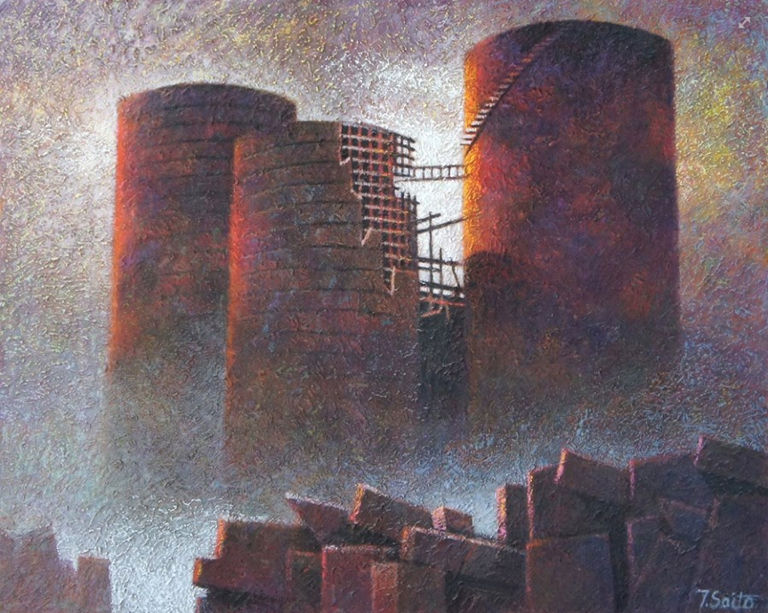 I can’t stop studying the application of pastel in the works by Gregoretti and Saito. Both paintings seem to be of catastrophic events – each equally powerful considering one is 5×7 the other