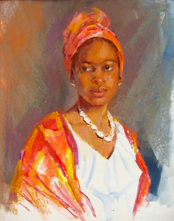 From the quiet of the last painting we move to one of warm colours and bold strokes. This is a direct and spontaneous capturing of the model yet done with a careful accuracy where it’s needed, particularly the face. I like the way Vishni has set off the pure and saturated colour on the model with a greyed yet still colourful background. Notice how the grey is repeated in the left and cooler side of the model’s face. Vishni leaves the white of the paper almost pure and repeats the white in the necklace and the eyes. Somehow the glaring white doesn’t overwhelm the painting as we keep coming back to the beautifully rendered face of the model. Lovely! Vishni doesn’t have a website but you can see more of her work here.