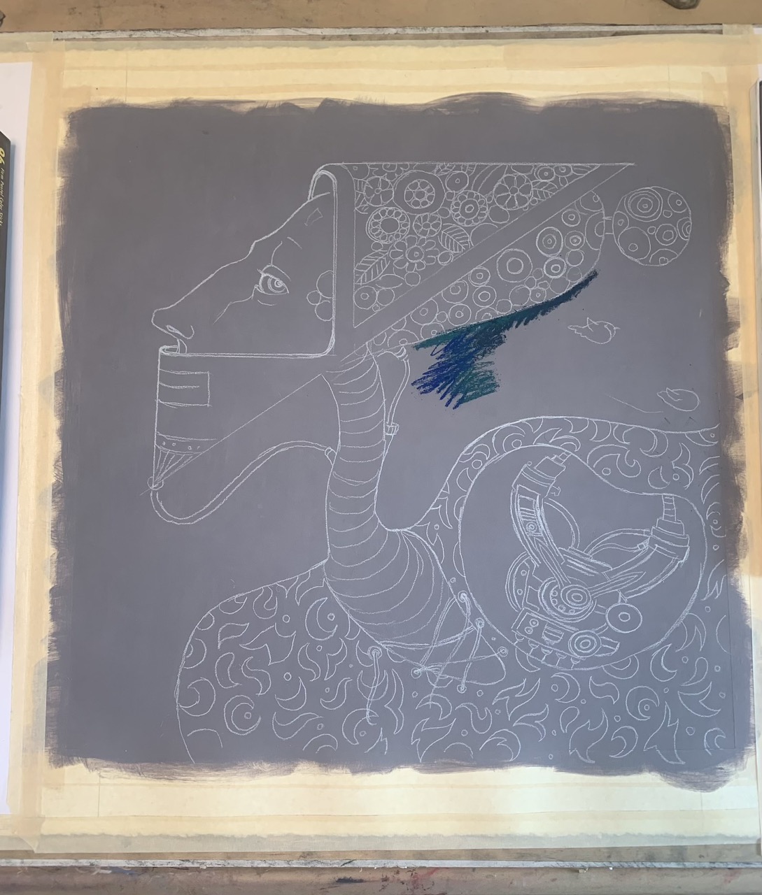 First I measure out my image size and tape off the borders so that the edges stay clean. Usually, two layers of the primer will suffice. The paper often buckles with the wet primer applied. Using two large sheets of ½ thick foam core board to sandwich the paper and weighting it with books or weights will flatten the surface perfectly. I sometimes leave the paper weighted in between the foam core for several days to ensure that it’s flat. I leave the paper attached to the foamcore because it offers a strong backing while working on my drawing.