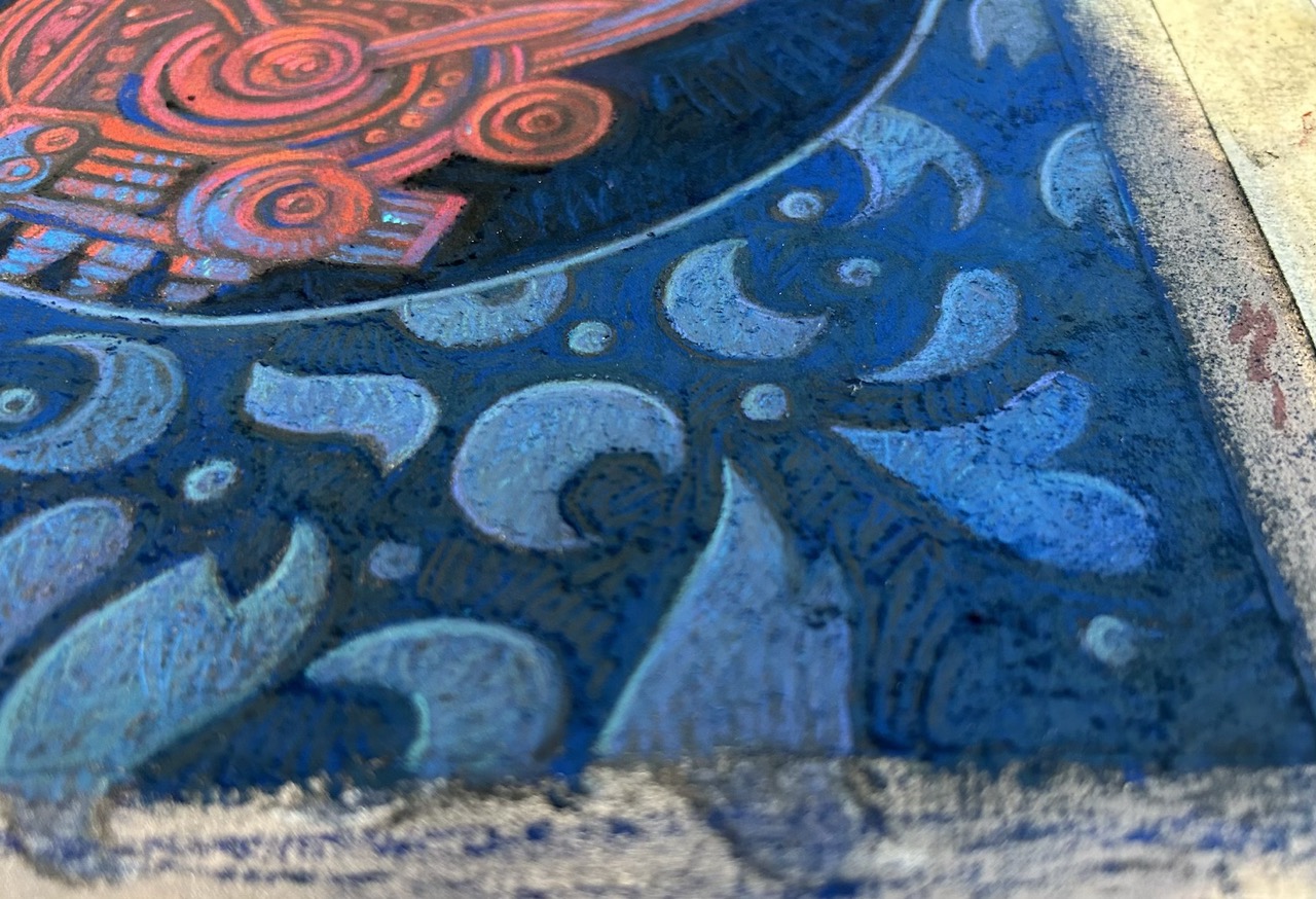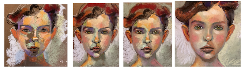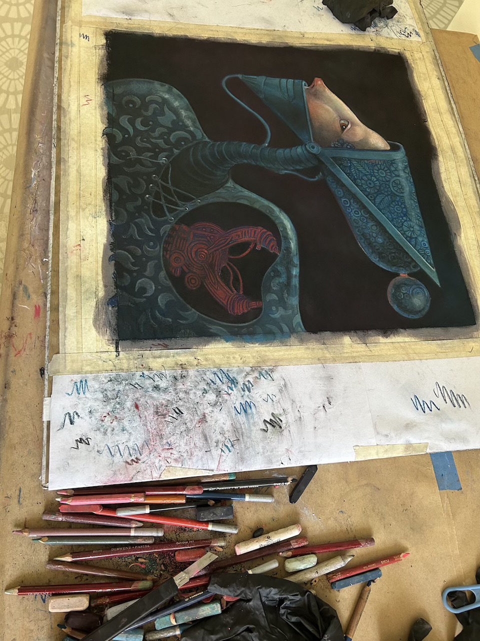 Sennelier and Terry Ludwig are the softer pastels that offer bright punches of colour and thick application. Going back and forth, I add layers, wipe out areas, reapply, and layer until I am happy with the texture and application. Using Krylon Workable Fixative in between layers allows for more applications and will allow the drawing to be knocked back in order to pull up the main areas of focus.