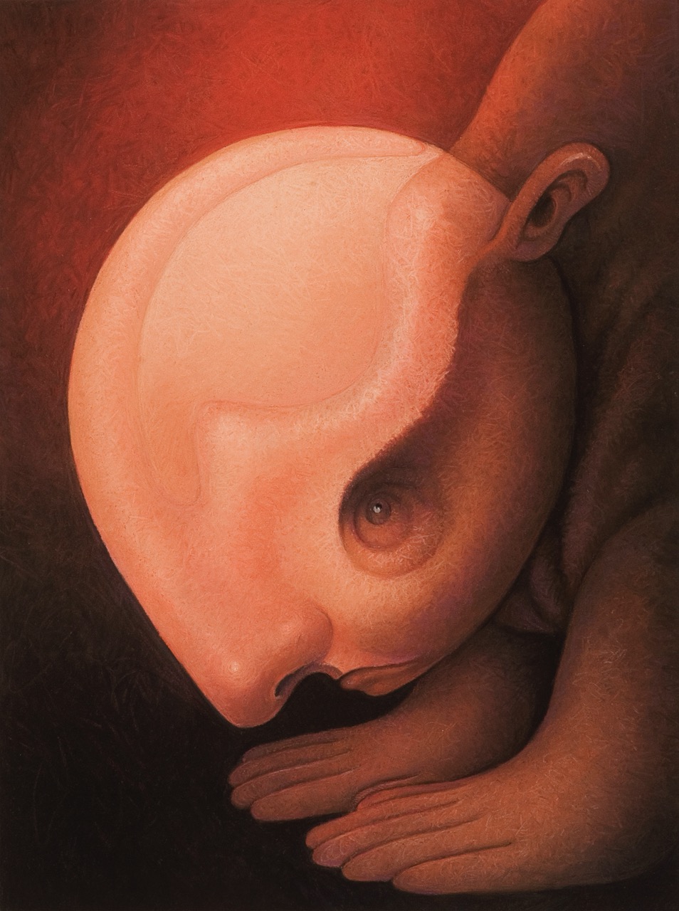 Michele Noiset, Cloned, 2011, Rembrandt, Sennelier, NuPastel on BFK Rives paper, 18 x 24 in. Inspired by the theme of cloning in the novel Never Let Me Go by Kazuo Ishigoro written in 2010. The book reveals that the characters held at a private “boarding school” are held in order for their duplicates in the real world to reap their organs when theirs start to fail. Cloning in the book means replacing the old with the new rather than the production of many.