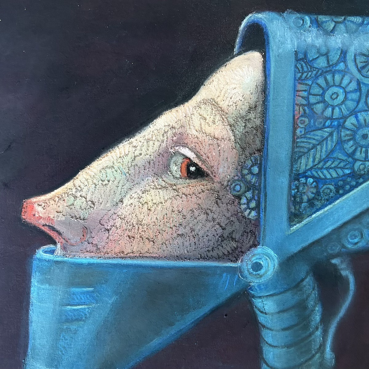 Michele Noiset, Bébé Blindé, Nupastel, Rembrandt, Sennelier, Terry Ludwig, Derwent pencils, Faber Castell, and Carb Othello pencils on BFK Rives paper primed with Art Spectrum colour, 16 x 20 in.