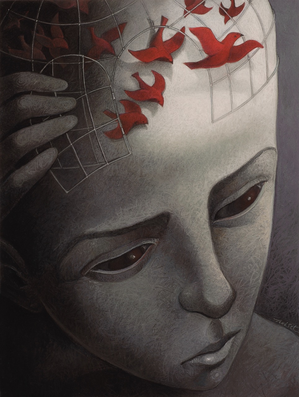 Michele Noiset, Mental Manipulation, 2011, Rembrandt, Sennelier, Nupastel on BFK Rives paper, 18x24 in. Inspired by the book, "1984" written by George Orwell in 1949. The novel explores the way that truth and facts within societies can be manipulated.