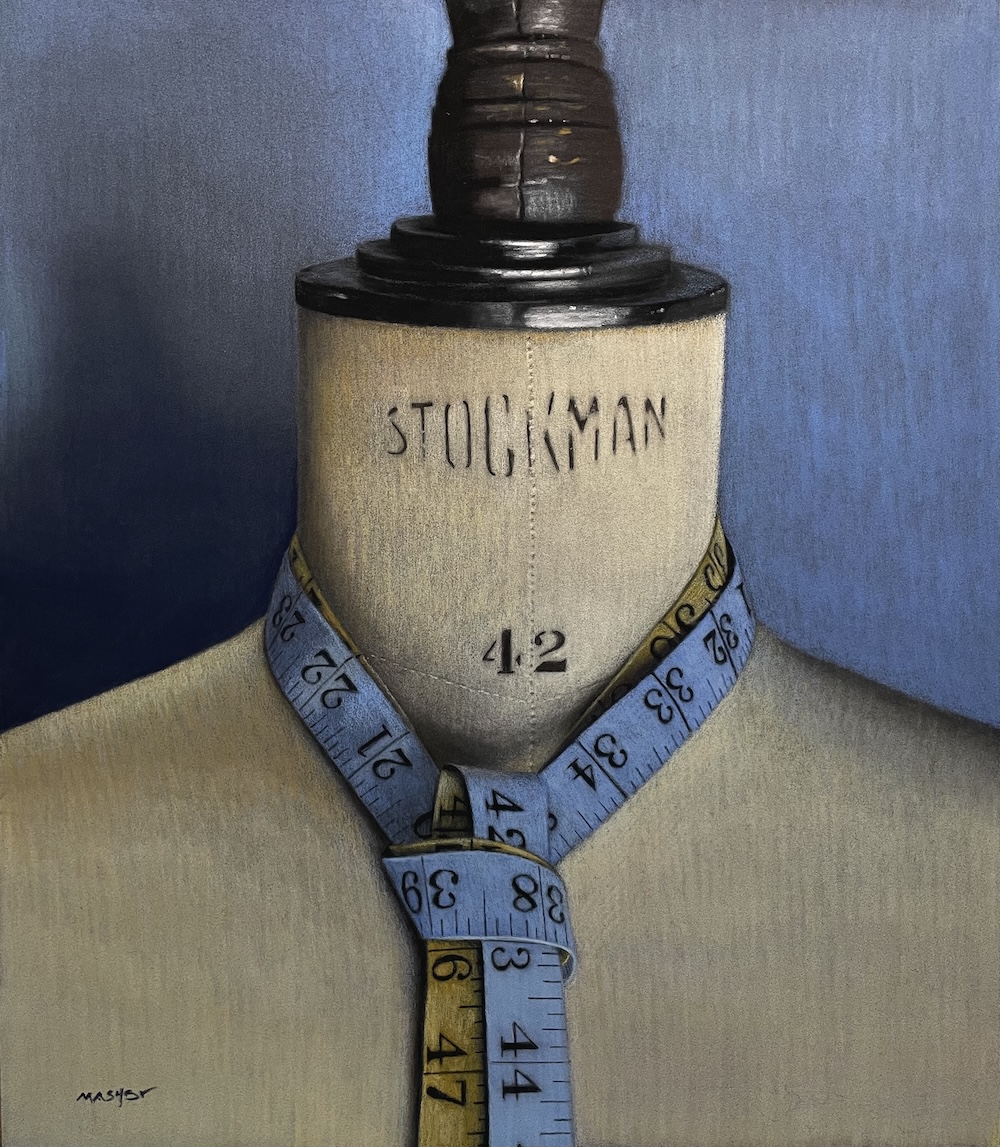 My first thoughts on seeing the painting was the idea of something old-fashioned. Elegant and old-fashioned. What appears to be a well-used measuring tape is tied around the neck of a dress mannequin with its slightly dinged wooden neck. To me, the painting speaks to the quiet dignity of craftsmanship, of wisdom, and the knowledge that comes from years of experience. It’s a portrait where the subject holds its head high, chest erect, proud. The mannequin stands in for the tailor who creates the clothing with the measuring tape worn like a necklace, a treasured accessory.