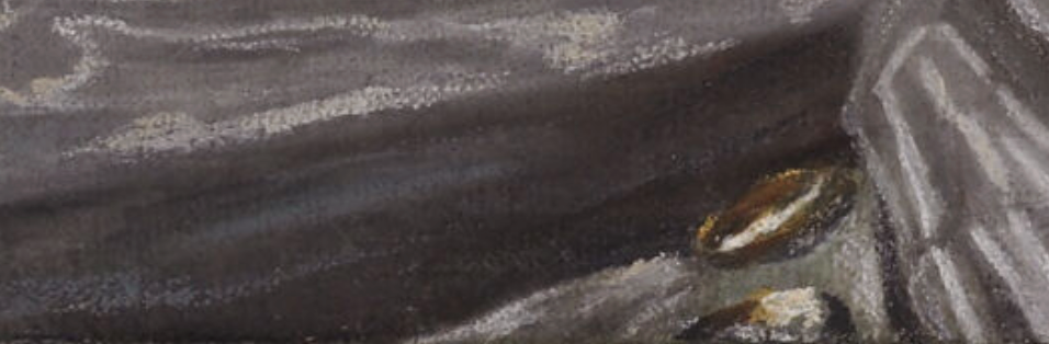 The turquoise velvety fabric has no highlights which is completely the opposite of the grey coat. Those crazy zigzags of light grey dazzle us! The frills have a transparency and look at the way the artist defines the edge with a sharp white line in places. Notice how little the frilled cuff lower left is defined, making sure our eye doesn’t linger long.