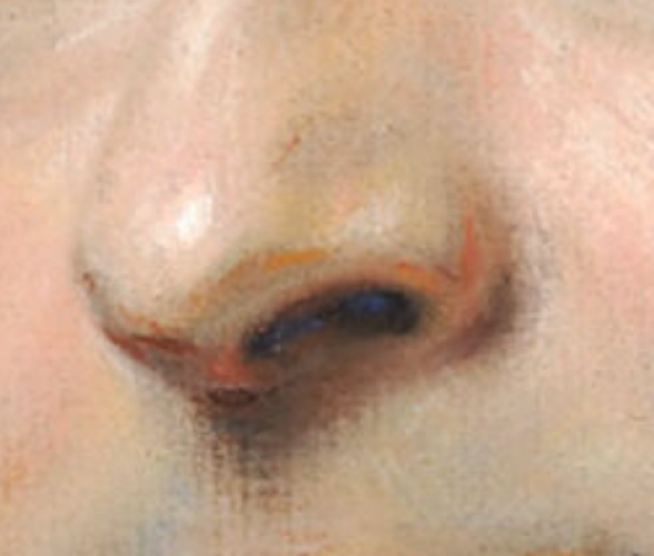 Ahhh such economy of description! The nose feels fully modelled from a distance and yet, as we look more closely, we can see how de La Tour structures the nose using colour temperature (warm versus cool) and value relationships. There is also a clear understanding of the shape and three-dimensionality of the nose. I love the restrained use of highlight and the unexpected touch of blue in the nostril. And look at the soft edge of the cast shadow.