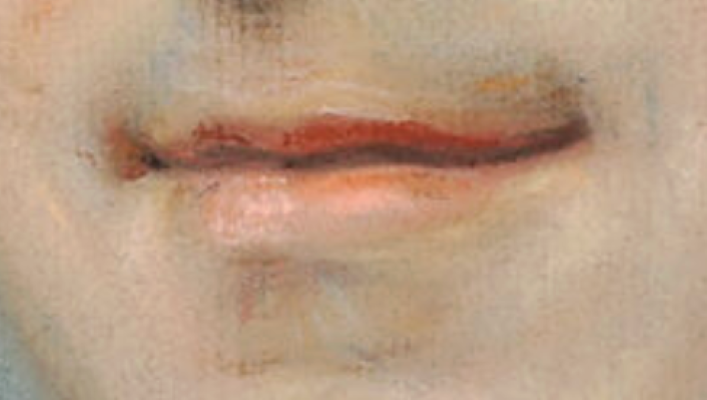 I’m always interested to see the hand of the artist at work and one of the things I’m always on the lookout for are remnants of the preparatory drawing. You can usually only see these with close looking. Here we see what looks like a faint line along the cheek that reveals a trace of the original drawing.