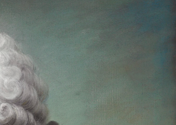 We can tell the sitter wears a wig because of the way the artist shows how the “hair” connects to the hairline — it’s a hard edge rather than the more natural transition of growing hair. There is no attempt to blend skin and hair.