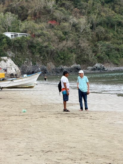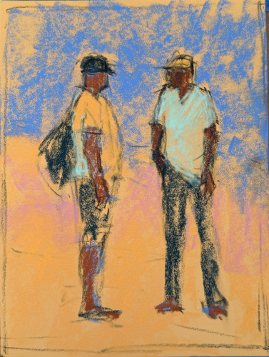 Looking back at some of the pieces I painted while in La Manzanilla, Mexico, I noticed a quiet thread running through three of them. Without setting out to, I found myself painting figures in conversation — pairs of people together, talking, waiting, simply being. Two men standing side by side in the water as one fishes. Two men chatting on the beach. Two women in conversation. Nothing dramatic. Nothing posed. And yet, everything I needed was there.