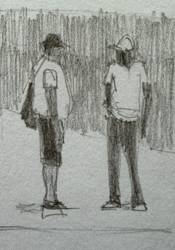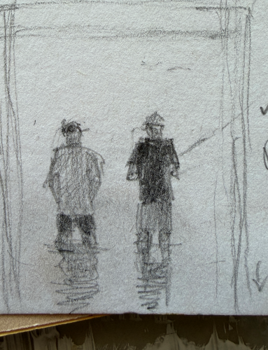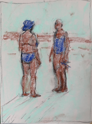 In these beach scenes, nothing particularly dramatic is happening. No one is rushing. No one is performing. The figures are simply together — standing, waiting, talking. That ordinariness is exactly what holds my attention. The challenge becomes one of noticing rather than inventing: how close they stand, whether they face one another or look out together, and how their bodies quietly echo or counter each other.
