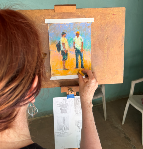 The softness of the Senneliers combined with the velvety surface of the Pastelmat asked me to slow down and pay attention in a different way. I couldn’t rely on habitual marks. Each decision felt more deliberate, from the first block-in to the final touches. I did keep to my usual habit of limiting myself to a small, specific palette for each piece and that helped keep the focus where I wanted it — on the figures and their relationship, rather than getting too caught up in colour elaborations or duplicating the reference.